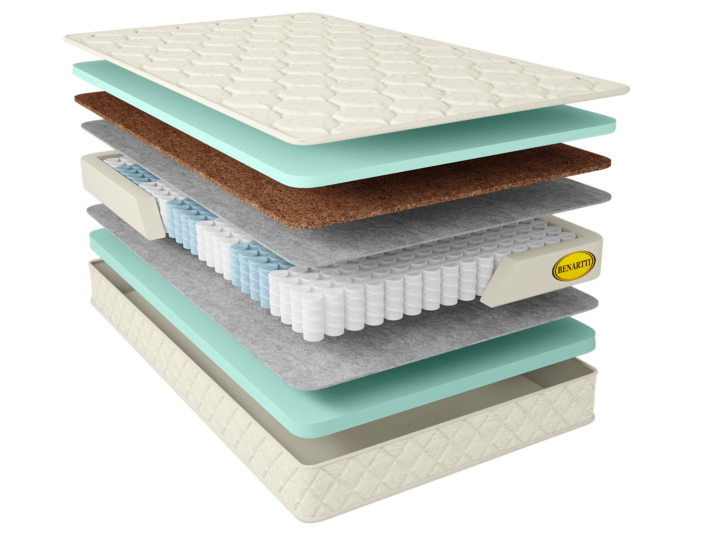 Для дополнительной защиты пружинного блока добавлен изоляционный слой из войлока, разделяющий и защищающий наполнители матраса и пружинный блок. С одной стороны матраса расположен слой кокосовой койры толщиной 1 см, придающий дополнительную жесткость и долговечность матрасу и поверх слой искусственного латекса высотой 3 см, обладающий анатомическим эффектом и износостойкими свойствами. С другой стороны матраса расположен слой искусственного латекса высотой 4 см, обладающий анатомическим эффектом и износостойкими свойствами. Чехол матраса, выполнен из хлопкового жаккарда, простеганного на экологически чистом материале Hollcon. Ткань обработана специальной антибактериальной пропиткой SANITIZED (Швеция). Пропитка обеспечивает полное уничтожение плесневых грибков, не дает развиваться микроорганизмам, пылевым клещам и микробам.