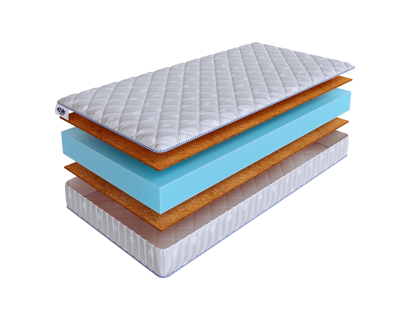 Слой кокосовой койры, расположенный с двух сторон матраса, придает поверхности жесткость и упругость, обеспечивает ортопедичность спального места.