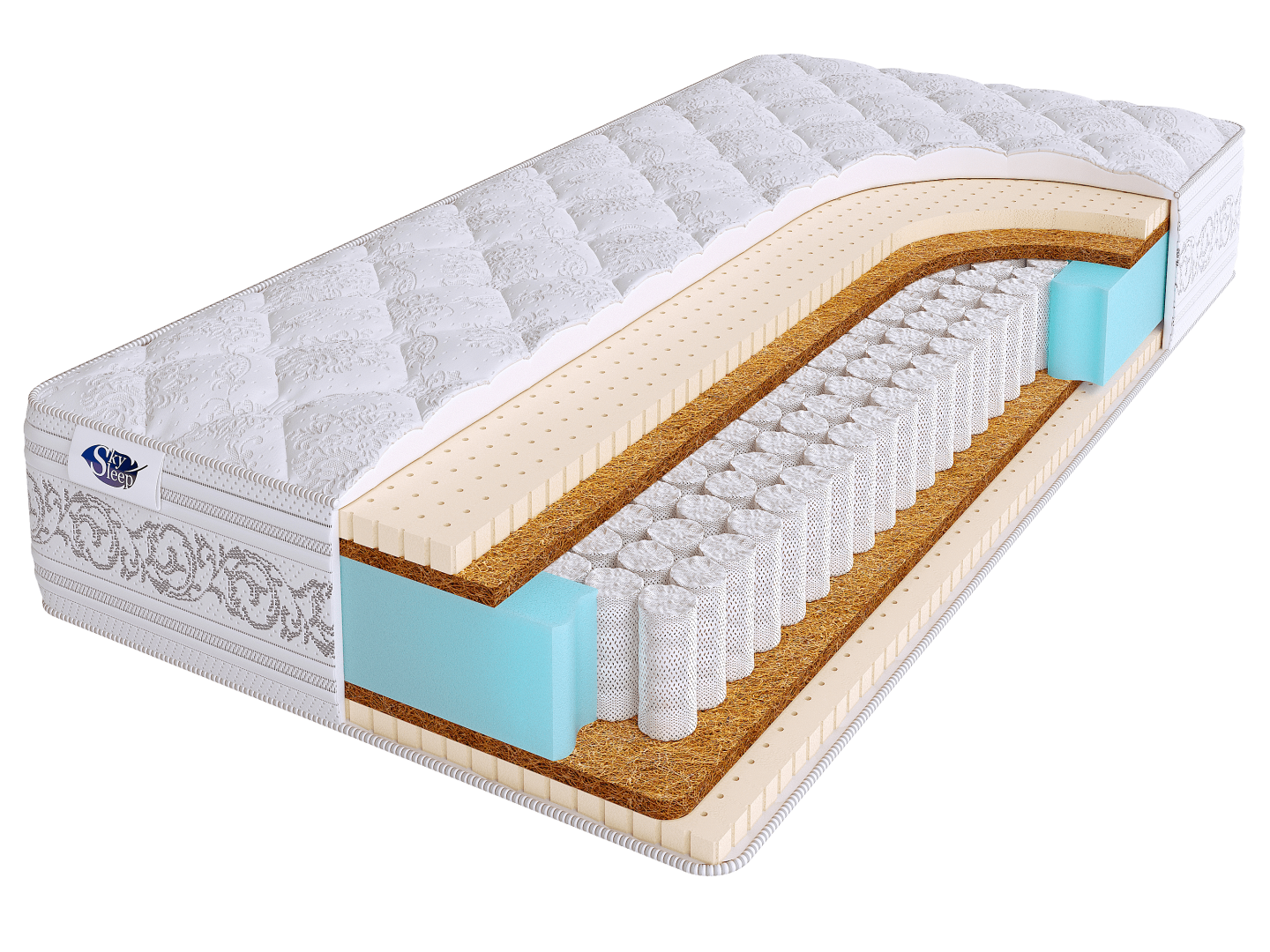В основе матраса лежит высокотехнологичный блок независимых пружин S500. Особенностью данного блока является то, что каждая пружина размещается в отдельном чехле из прочного воздухопроницаемого материала. Это позволяет пружинам самостоятельно реагировать на вес тела человека и обеспечивать ортопедическую поддержку позвоночника.